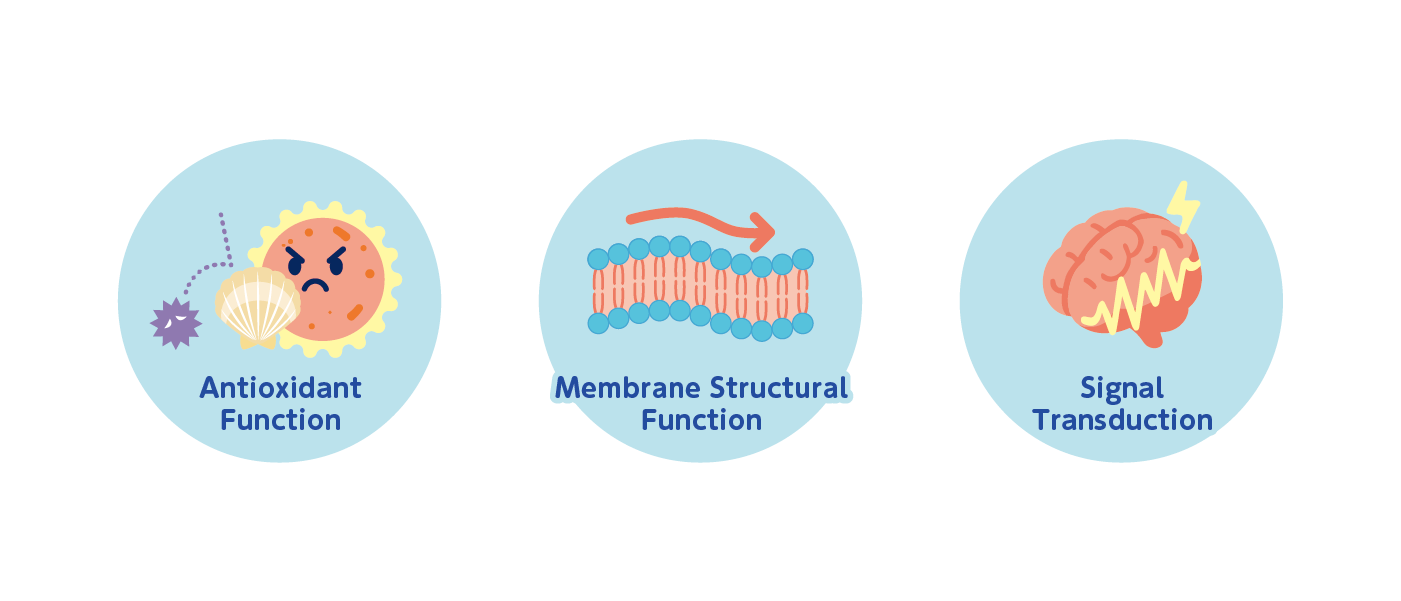 Through these combined functions, plasmalogens have been suggested by various studies to contribute to maintaining memory and learning, reducing the risk of age-related cognitive impairment and Alzheimer’s disease, as well as supporting emotional well-being and improving sleep quality.