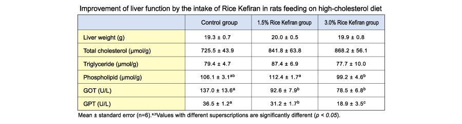 Rats fed a high cholesterol diet exhibited symptoms of hypercholesterolemia and fatty livers, and deterioration in liver function. In both groups treated with 1.5 and 3.0% Rice Kefiran, transaminase (GOT, GPT) activity was significantly reduced. These results suggest that Rice Kefiran acts to improve liver function.