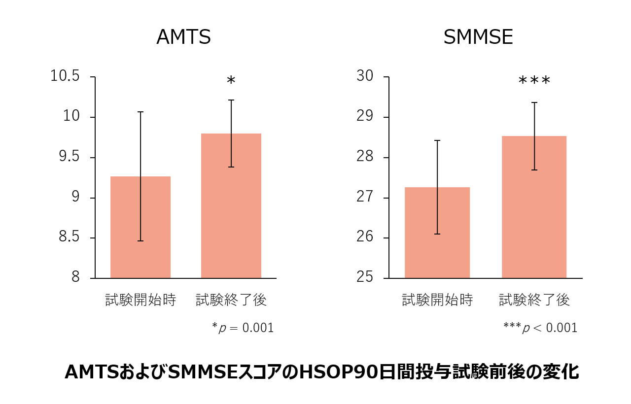 主観的な認知機能低下、あるいは衰えを感じている被験者 30名に対し、ホタテ由来プラズマローゲンとして0.5 mgを含むHSOPカプセル を1日1回1粒、 90日間投与し、AMTS(簡易精神状態質問票)とSMMSE(標準化Mini-Mental State Examination)の2つの尺度で認知機能の変化を評価しました。その結果AMTSでは、 9.267 から9.800への有意なスコアの増加が(*p = 0.001)、SMMSEでは、27.267 から28.533 への有意なスコアの増加が観察されました(***p < 0.001)。